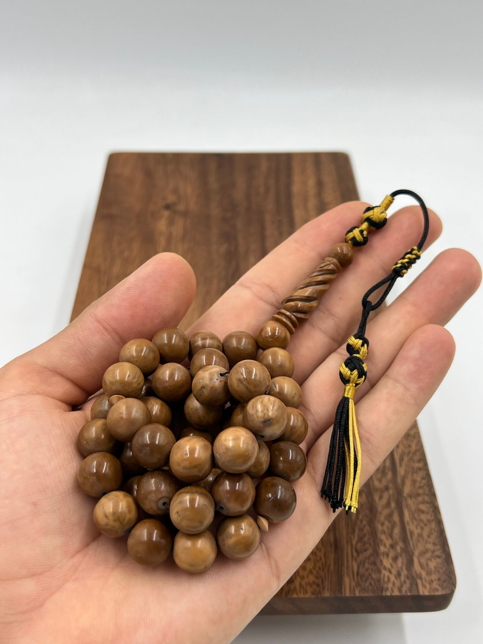 مسباح خشب الكوك : مر المسباح بعدة مراحل ليتكون لك هذا الجمال، بداية من تشكيل المادة الخام من ثمرة الكوك إلى شك المسباح في الخيط المتين، يتميز بأناقة التصميم وثبات الزيوت العطرية على السبحة.