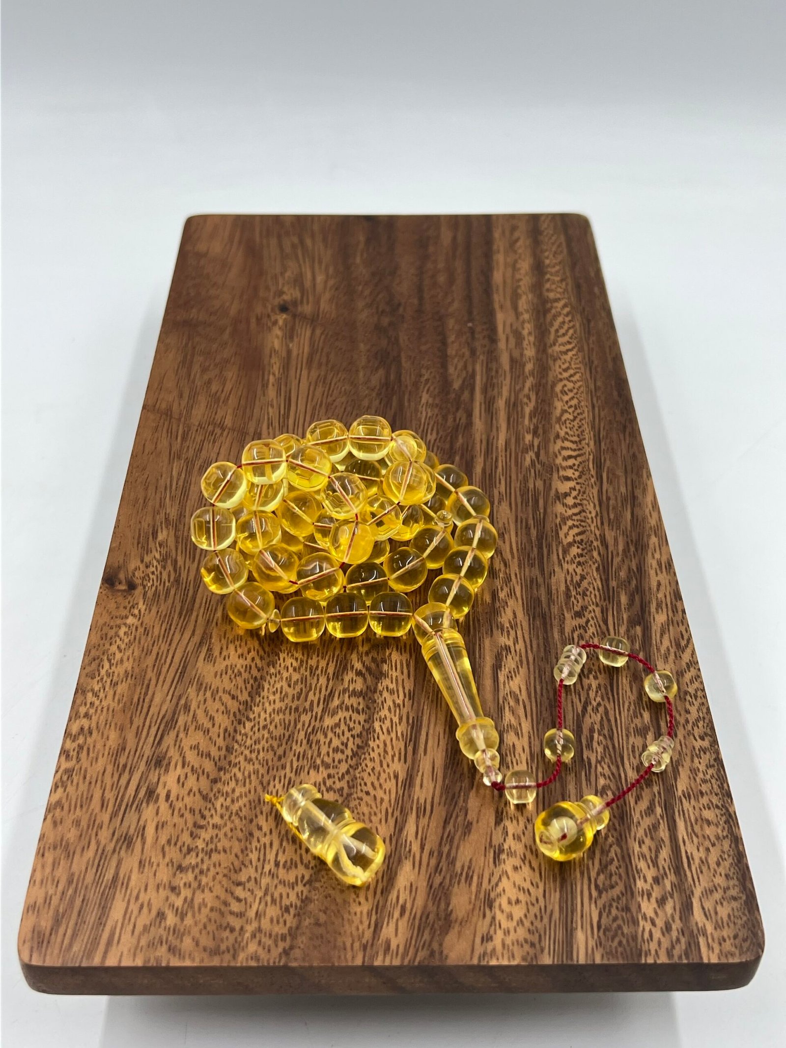 سبحة مصنوعة من مادة الكاست أو البكلايت ذات درجة شفافة عالية، تتميز بوزنها ، وصلابتها، وصوتها الرنان المميز عند ملامسة الخرز.
