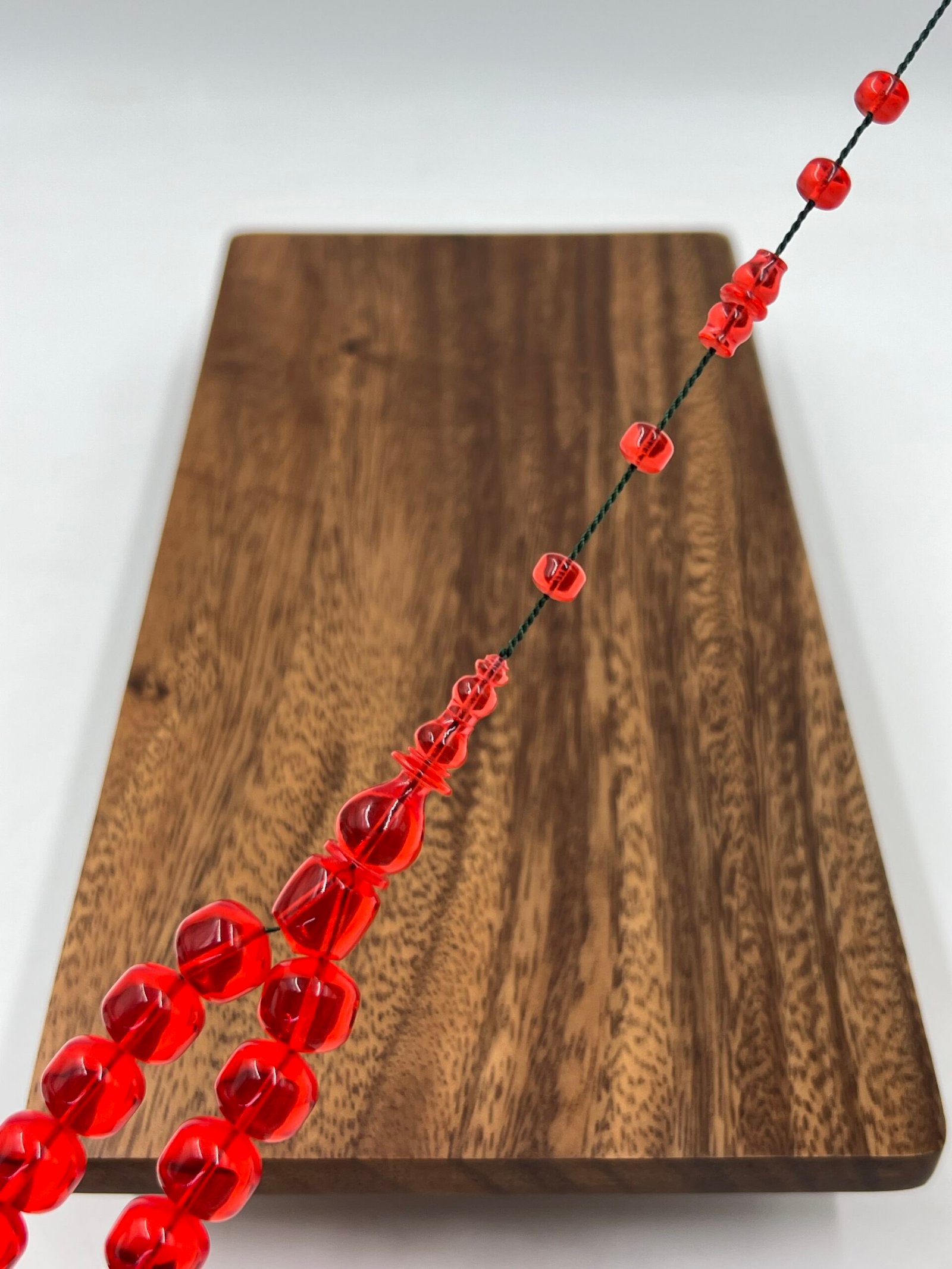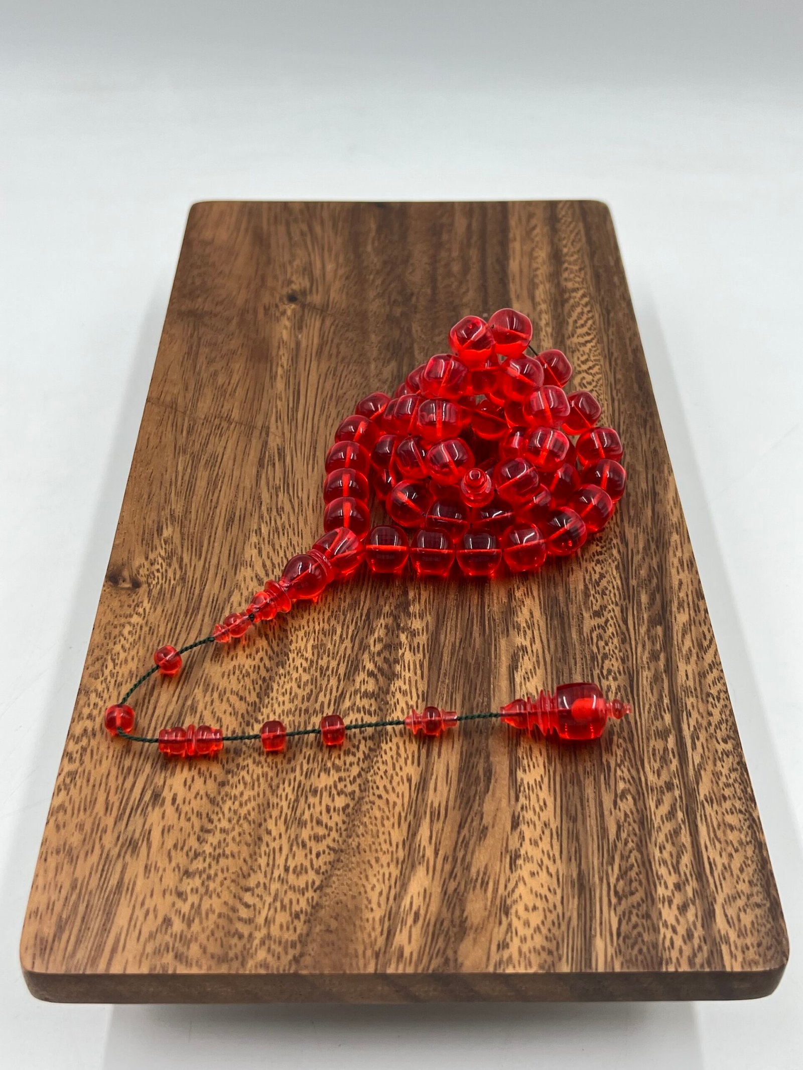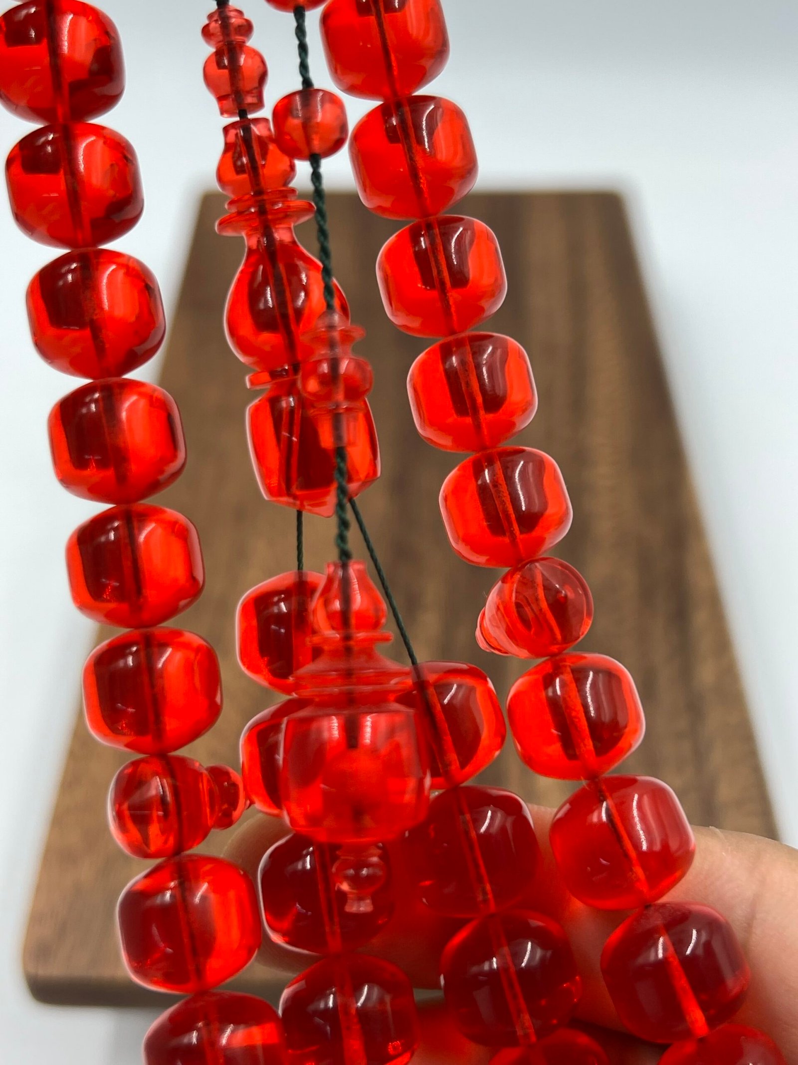 سبحة مصنوعة من مادة الكاست أو البكلايت ذات درجة شفافة عالية، تتميز بوزنها ، وصلابتها، وصوتها الرنان المميز عند ملامسة الخرز.